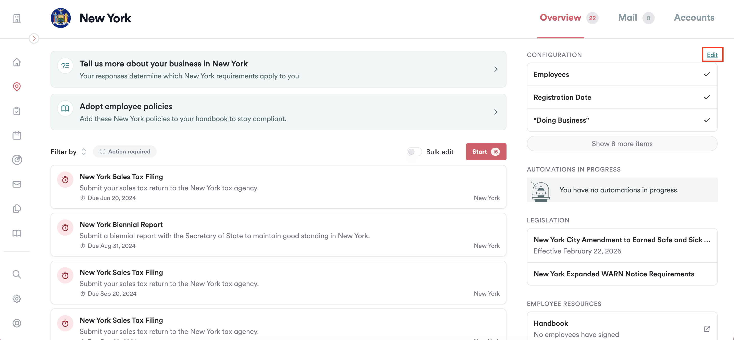 To review your configurations for each location, go to Locations → Select the state that needs review/update → Select 'Edit' next to the Configuration set up → Update answers as needed.